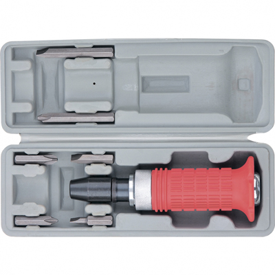 Отвертка имеет обрезиненную рукоятку с протектором, оснащена ударными битами SL – 7 х 35, 8 х 35, 8 х 65 мм